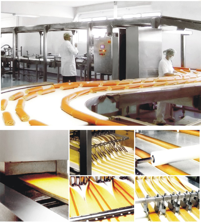 主要功能及用途 該設備是我公司開發(fā)的新一代蛋糕生產流水線,從攪拌成形、擠料、烘烤、擠餡、卷圓、切割、冷卻殺菌、包裝。該機全部采用變頻、光、電、氣全電腦控制,使操作省事、省力,食品既衛(wèi)生保質期又長,可選擇不同類型的隧道爐(如電力、燃油、燃氣、導熱油)。